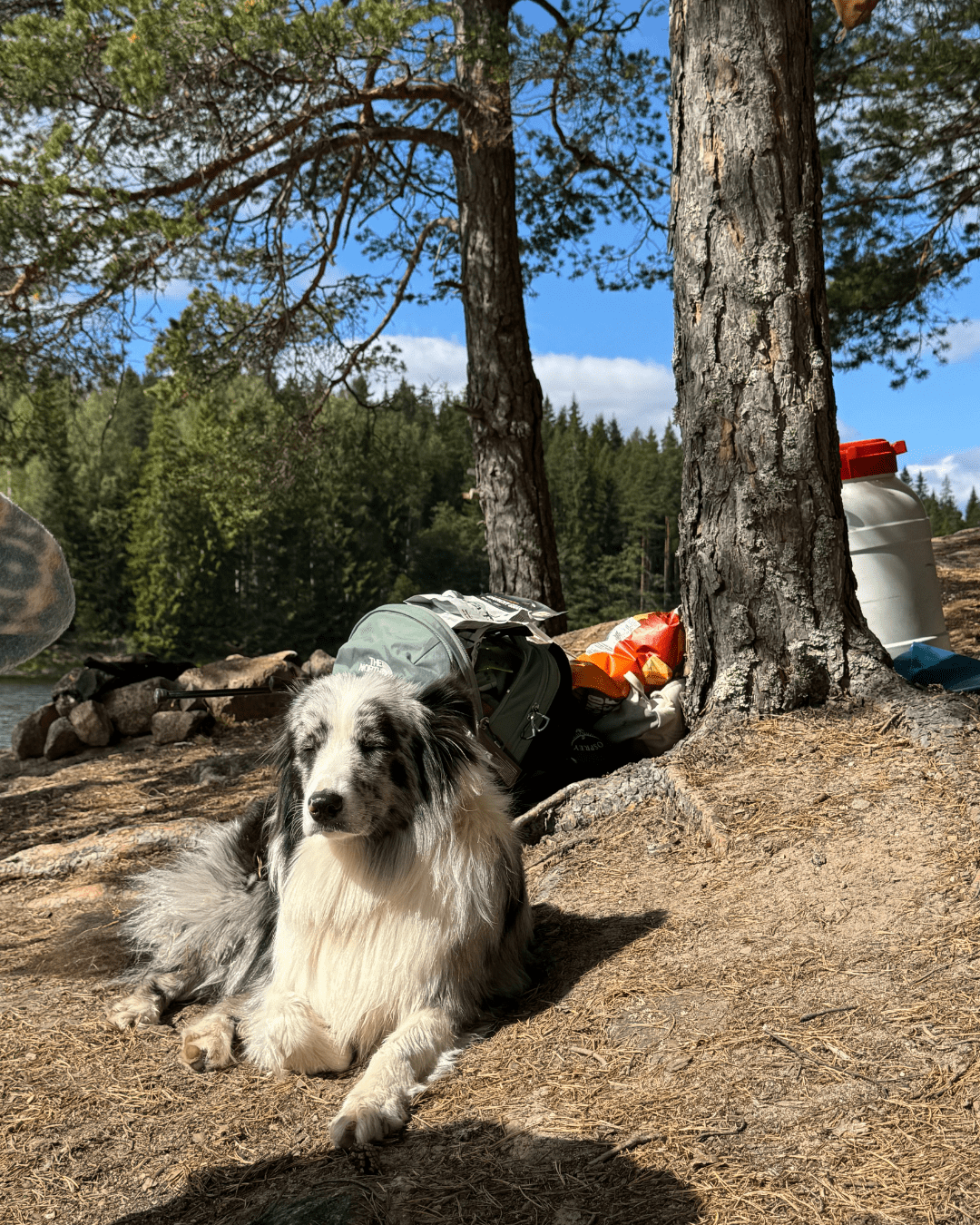 By late afternoon, we reached a bigger island that immediately looked right for the night. Tall trees, flat ground, a quiet stretch of shoreline: simple and exactly what we needed. We set up the tent under the pines, laid out the cooking gear, and watched Lumi do her usual “patrol laps” like she somehow owned all of Värmland.