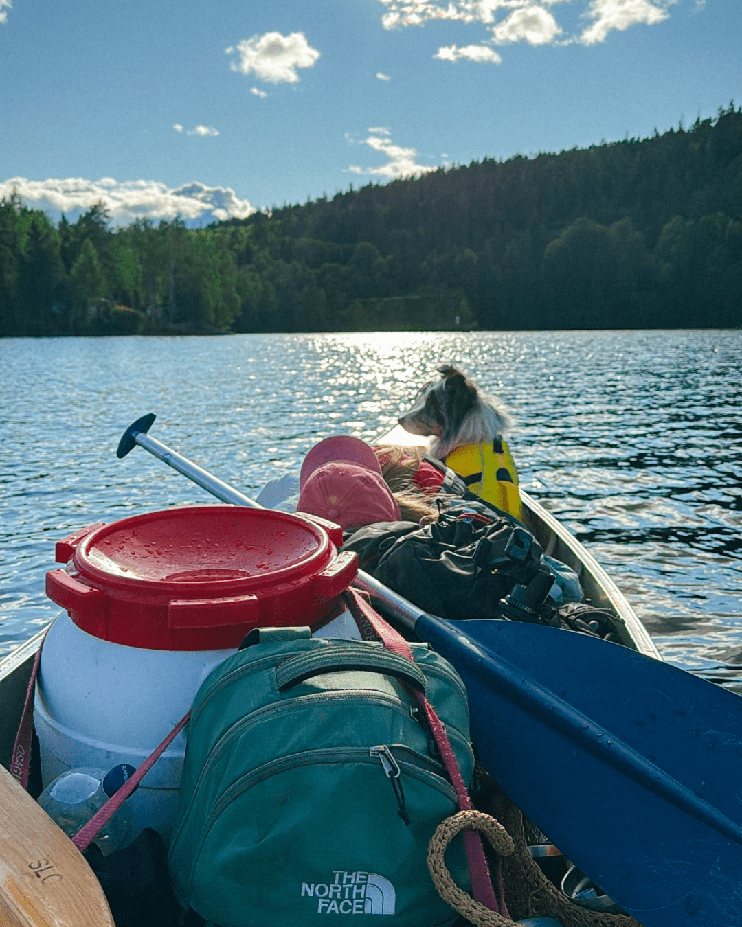 Day 3 started just as sunny and calm as Day 2. By then we were fully in the rhythm of the trip: slow mornings, smooth paddling, nothing rushed. Lumi jumped into the canoe like she finally understood the drill, curled up, and immediately fell asleep.